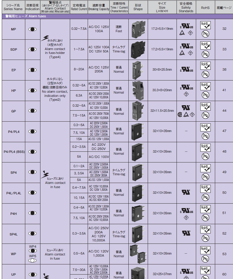 - 해당 제품들은 MP,SDP,HP,GP,P4, UP등 퓨즈가 있으며, 퓨즈홀더에 따라서 알람역활도 할 수 있습니다.